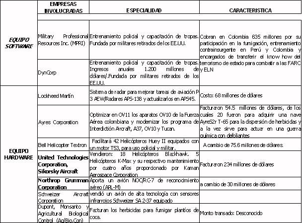 Es digno destacar que algunas de estas Brigadas, especialmente las que se encuentran situadas en las cabeceras de los ríos Amazona y Orinoco, realizan pruebas de las fumigaciones que se aplican en Bolivia, Perú y Colombia bajo el pretexto de erradicar el cultivo de la hoja de coca, ocasionando graves daños en la salud de los habitantes y en otros cultivos de vital importancia para las comunidades, puesto que el Glifosato y el Hongo Fusarium oxysporum tiene efectos nocivos sobre los pobladores. Estos sitios en su mayoría no están comunicados por vía terrestre con el centro y resto del país, pero sí vinculados a través de la urdimbre de la guerra, pero ello no es impedimento para la estrategia del Plan Colombia, porque no fue concebido ni instrumentalizado para un país, su intención es abarcativa, regional y con un interés geopolítico, por ello los brazos extendidos del Plan llegan a otros países, de ahí que veamos movimientos en Panamá (266 Km. de frontera) en la región donde habitan los indígenas Payas y Panuza en Panamá, cerca del Darien y una pista de aterrizaje en Metetí, destinada para la aviación norteamericana y especial para el arribo de aviones Hércules. Hacia el Sur, en Ecuador (586 Km. de frontera) se conecta con la Base Manta, ocupada por 5000 soldados y seis naves P3 de 4 turbinas y doce militares estadounidenses, desempeñando labor de espionaje a través de captación de imágenes satelitales, interceptaciones telefónicas y apoyo logístico a los ejércitos de Perú y Colombia para contrarrestar a los narcotraficantes y guerrilleros. A partir del 9 de marzo del 2002, se congregaron grupos militares en retenes permanentes y acordonamiento desde la base Militar Ciro Alegría hasta El Milagro en Bagua, frontera con Colombia; desde Caballococha hasta Inquitos y Pijuyal, cercando toda la parte amazónica. En Perú (1,625 Km. de Frontera) en varios puntos fronterizos se desplazan cerca de 2.000 militares que se encuentran en movilización permanente; sin embargo, en la frontera con Brasil (1,645 Km.) la colaboración no es estrecha entre los dos gobiernos, debido a que Fernando Henrique Cardoso se resiste a involucrarse en el conflicto y prefiere patrullar y vigilar de manera independiente las ciudades norteñas de Tabatinga y San Gabriel a través del Sistema de vigilancia amazónica (SIVAM) y la base militar recién establecida en la zona descrita, la cual se suma a las bases aéreas de Boa Vista (Roraima) y Manaos (Amazonas) Con respecto a Venezuela (2,219 Km. de frontera) el Plan Colombia ha tenido serias dificultades de extenderse hacia ese país porque el comportamiento y posición de Hugo Chávez confronta con la visión militar de los militares norteamericanos y colombianos. A este factor ideológico, se le suma el interés económico estratégico que existe entre Brasil y Venezuela a partir del acuerdo que permitió tender 676 kilómetros de cables que transportan energía de 200 megavatios hora de Guri a Roraima, lo que le aportará a Venezuela 9 millones de dólares anuales por venta y 800 mil más por costo de operación, y se firmó el acuerdo con una vigencia hasta el 2020. No obstante, el interés de la administración Bush sigue vigente porque tanto Colombia como Venezuela son países que tienen frontera con la costa caribeña y la zona andina y en esa región existe gas en abundancia que llama la atención de diversas empresas norteamericanas. Asimismo, el factor Chávez propicia una situación incómoda por el triunfo de Lula en Brasil y el potencial subversivo de los indios en Ecuador; además, Venezuela es un suministro de petróleo seguro que puede aliviar la economía norteamericana en una eventual guerra con Irak y la vulnerabilidad de Arabia Saudita. Con base a lo anterior, es entendible que la convulsión que vive Venezuela en la segunda mitad del año 2002 no es un hecho fortuito, sino parte del cometido del Plan Colombia que trata de extender sus tentáculos hasta el territorio bolivariano, acompañando a los empresarios, los militares y al pool de los medios de comunicación para que generen una situación de caos para que renuncie Chávez o adelante las elecciones, lo cual configuraría un mejor cuadro político para las aspiraciones de los estrategas de la administración Bush. Los soportes financieros y los ganadores de los Planes La esfera bélica de los planes en ejecución es el verdadero negocio de la guerra, puesto que detrás de cada incursión de carácter militar está una empresa y un grupo de inversionistas que lucran con el dolor de los pueblos latinoamericanos. El soporte militar está dividido en dos aspectos, los que proporcionan el equipo de software y el hardware. Veámoslo: